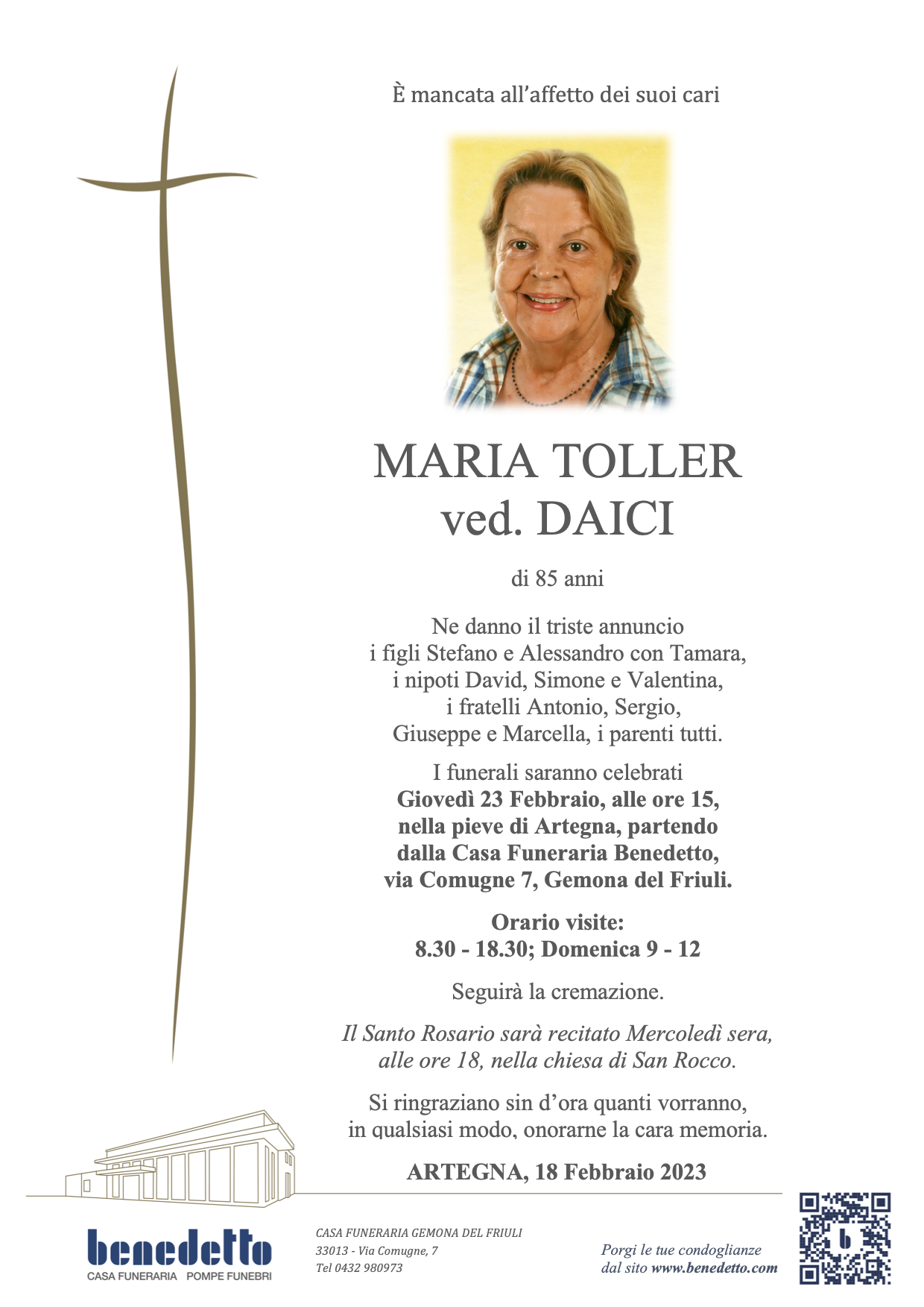 Lascia gratuitamente un messaggio di cordoglio, sarà nostra cura consegnarlo ai congiunti di MARIA TOLLER.