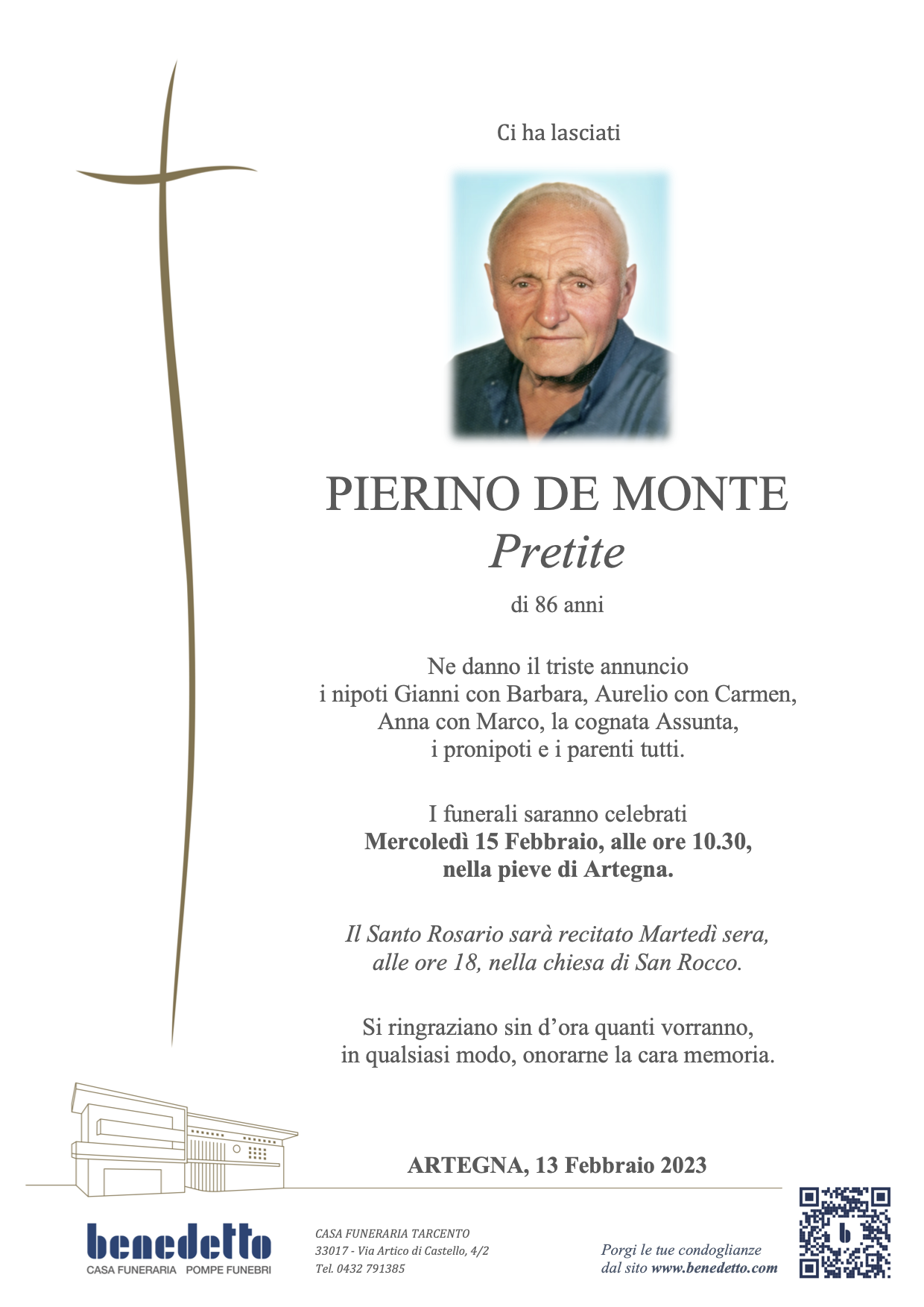 Lascia gratuitamente un messaggio di cordoglio, sarà nostra cura consegnarlo ai congiunti di PIERINO DE MONTE.