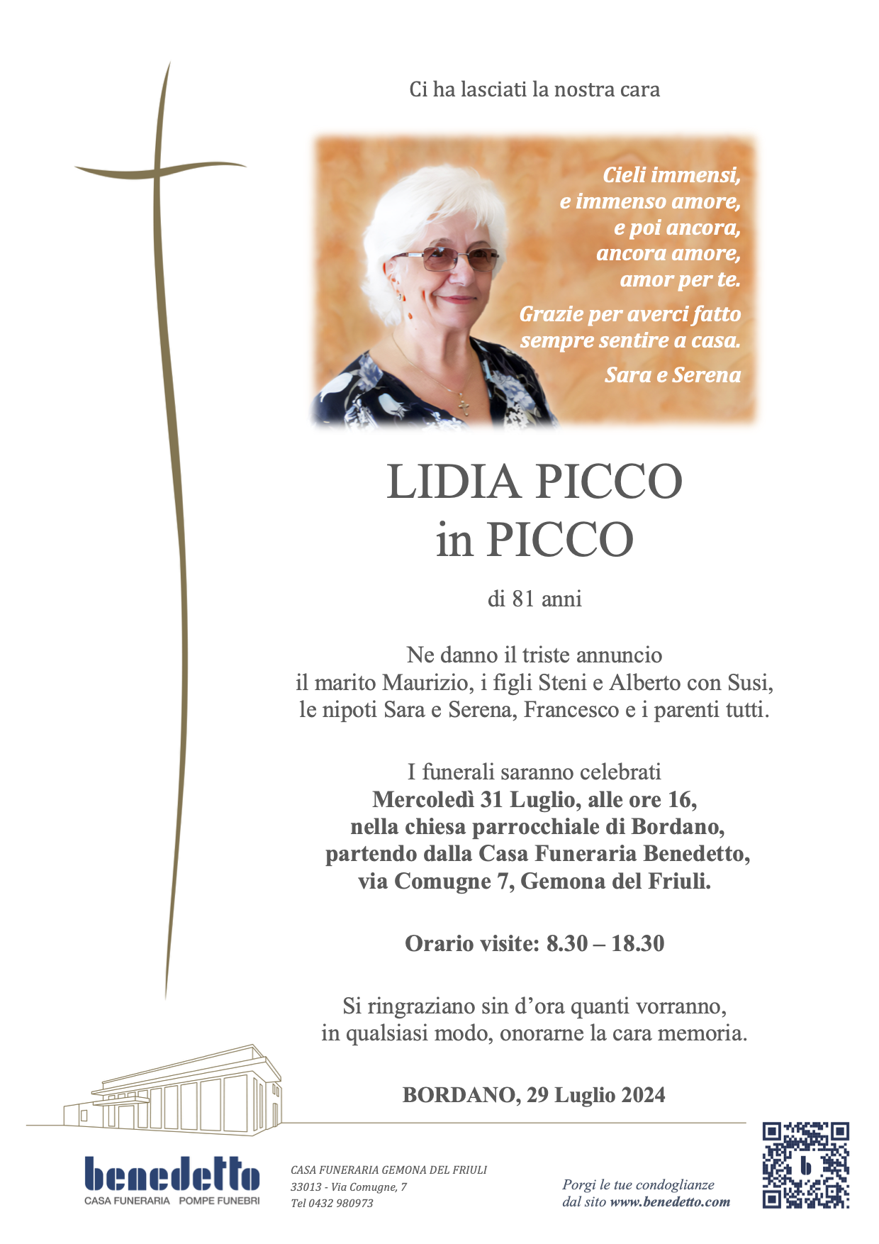 Lascia gratuitamente un messaggio di cordoglio, sarà nostra cura consegnarlo ai congiunti di LIDIA PICCO.