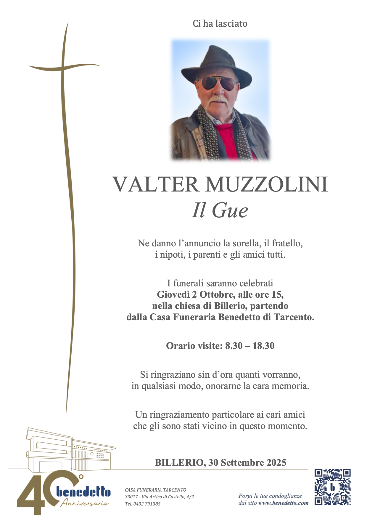 Lascia gratuitamente un messaggio di cordoglio, sarà nostra cura consegnarlo ai congiunti di VALTER MUZZOLINI.