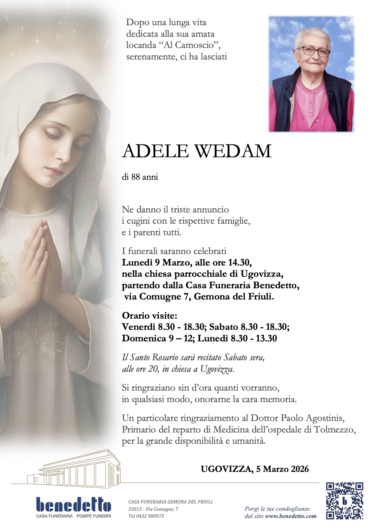 Lascia gratuitamente un messaggio di cordoglio, sarà nostra cura consegnarlo ai congiunti di ADELE WEDAM.