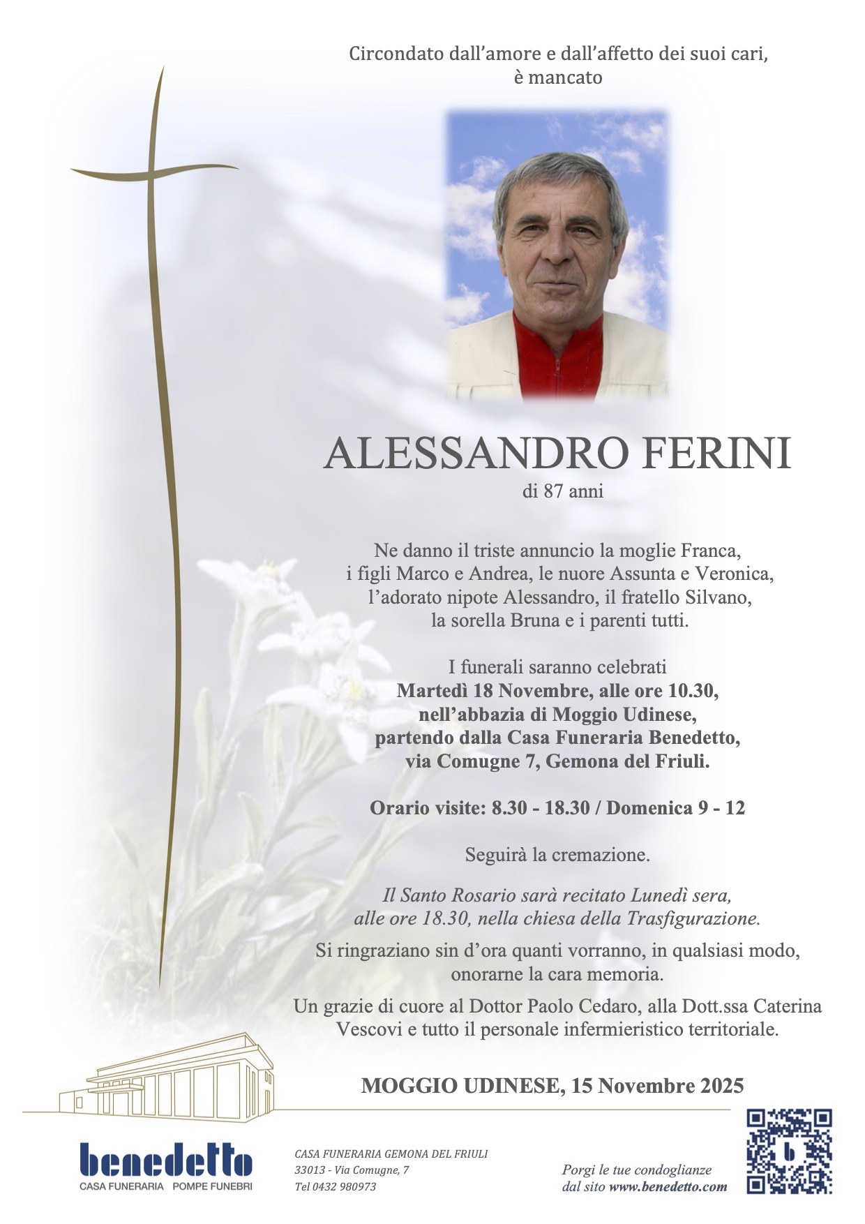 Lascia gratuitamente un messaggio di cordoglio, sarà nostra cura consegnarlo ai congiunti di ALESSANDRO FERINI.