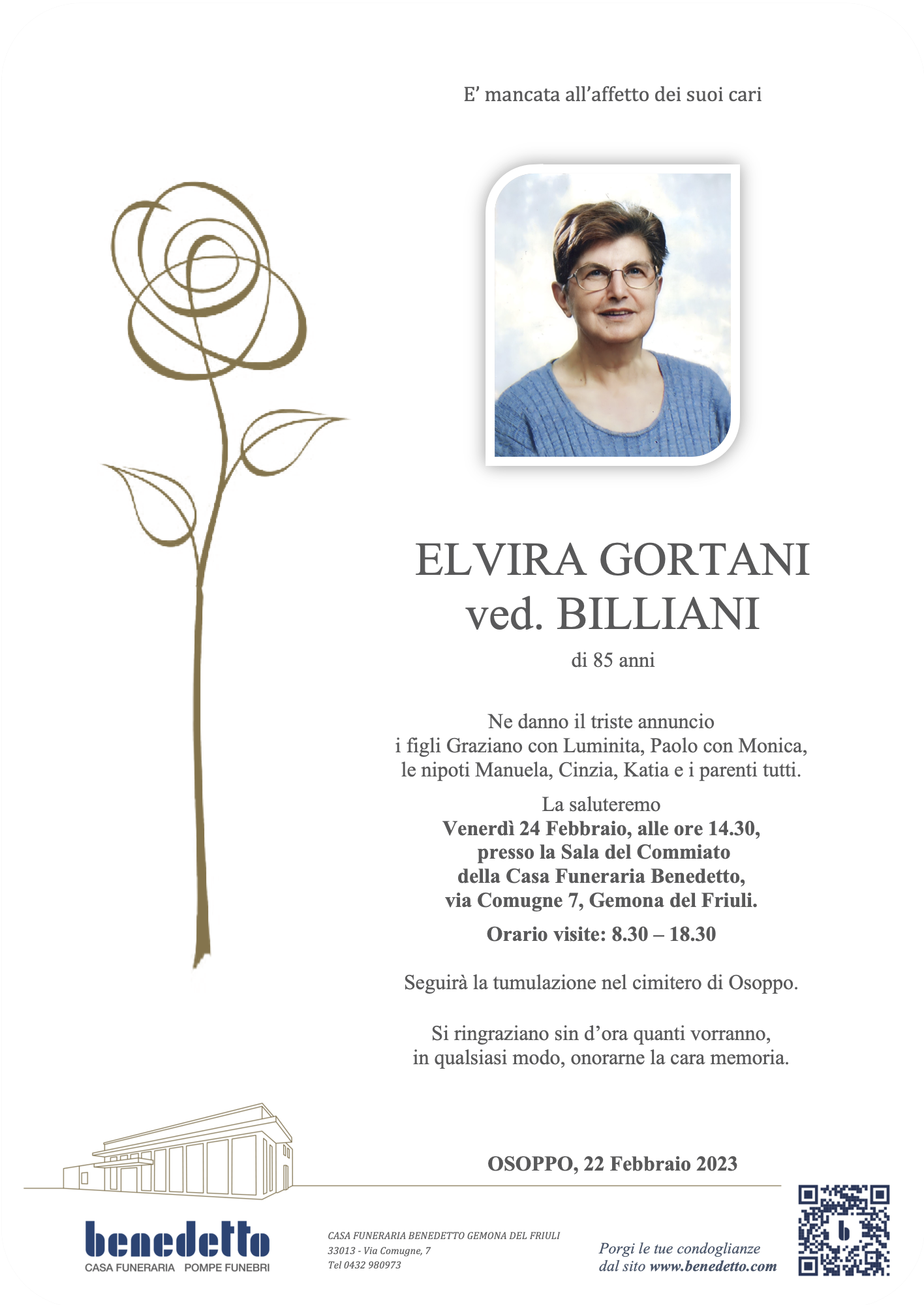 Lascia gratuitamente un messaggio di cordoglio, sarà nostra cura consegnarlo ai congiunti di ELVIRA GORTANI.