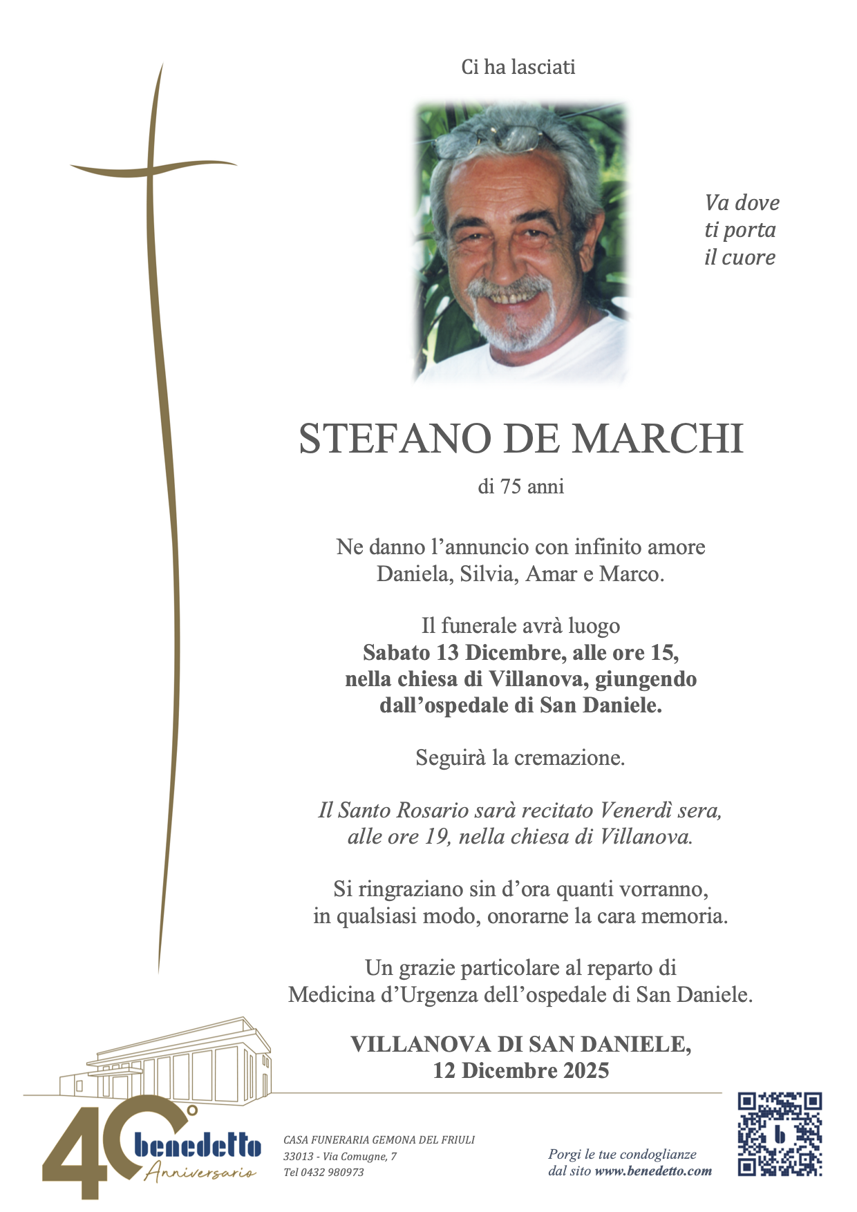 Lascia gratuitamente un messaggio di cordoglio, sarà nostra cura consegnarlo ai congiunti di STEFANO DE MARCHI.