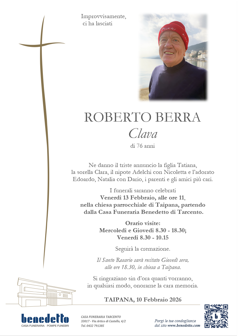 Lascia gratuitamente un messaggio di cordoglio, sarà nostra cura consegnarlo ai congiunti di ROBERTO BERRA.