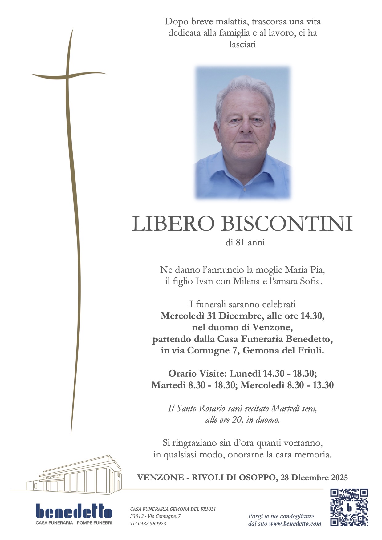 Lascia gratuitamente un messaggio di cordoglio, sarà nostra cura consegnarlo ai congiunti di LIBERO BISCONTINI.