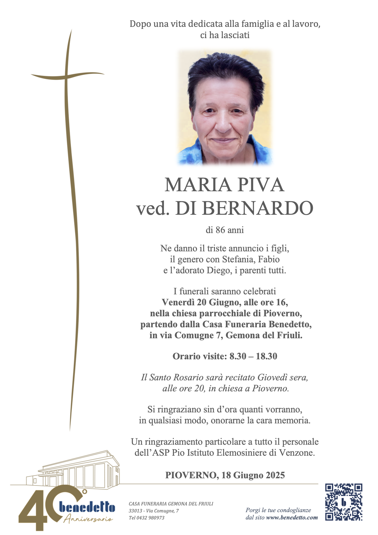 Il tuo messaggio verrà stampato e consegnato alla famiglia di MARIA PIVA.